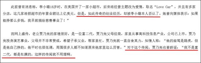 除了成长环境不一样,其实也曾有人起底了贾乃亮和李小璐的身价,报导中说贾乃亮的父母都是经商的,有一家上市公司。而李小璐在美国开了一家小超市,后来还发展成连锁店,营业额上亿美元,不过都被否认了。李小璐还表示如果自己能挣这么多钱,早就捐给慈善事业了。