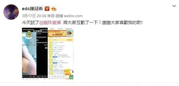 3月17日晚上八点左右,陈冠希在微博中发出了一张某直播平台上的截图,自称在直播平台上和粉丝们互动,粉丝们都表示很喜欢他的歌,经过调查,发现他在与一个女主播名叫“梦楠来啦”的直播间里,与大家互动,而且还送上了大礼物,一出手就是10万元,真是土豪啊!