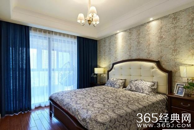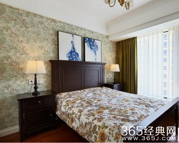 主卧也有一个大的落地窗,很明亮。壁纸和床单都是花型设计,但是看起来很大气,一点也不俗。