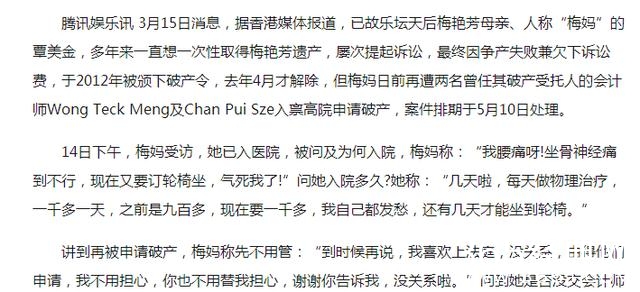 前两天,有则消息让我颇为吃惊,梅艳芳的妈妈又破产了,要知道,这些年她为了争夺梅艳芳的那笔遗产,可是频频打官司欠下巨额诉讼费,上次破产是2012年,不到五年,又破产了。
