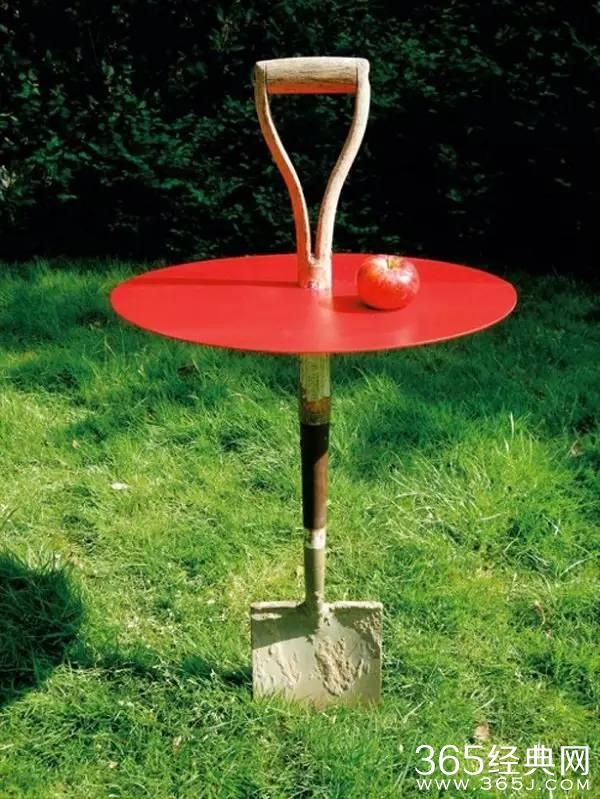 一把铲子,可以有无数个创意,这个直接结合一个圆盘,变成一个院子里的桌子,搭配靓丽的红色,和周围的环境形成明显的对比,很特别的风景。