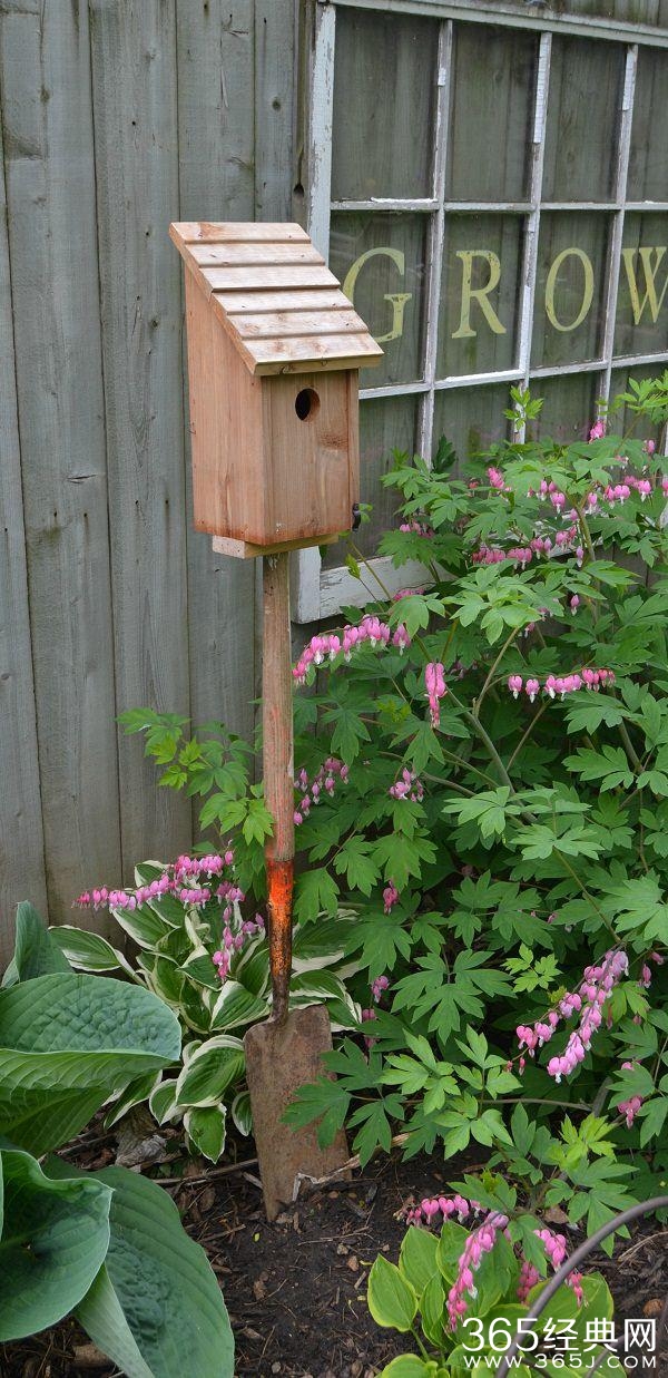 旁边栽种的是一些荷包牡丹,搭配各种品种的玉簪,非常适合没有阳光的角落里,这样也能吸引一些小鸟,用一把废弃的铲子,搭配一个小木屋,就感觉特别温馨。