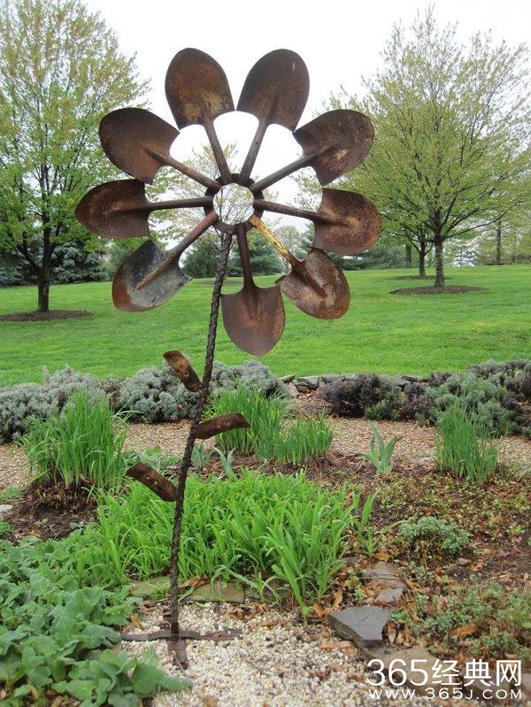 这个工具品搭配院子里的花草,特别有艺术感,一些废弃的旧铲子,变成了花瓣,搭配钢筋制作的花茎,还有废弃铁皮制作的叶片,看起来栩栩如生,当然这个创意需要一定的焊接手工。