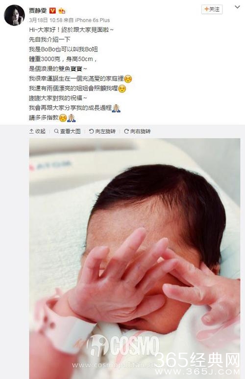 首先我们要插播一条好消息,贾静雯已经顺利生下第三胎女儿Bo妞,虽然还没有曝光正脸照,但是我们相信应该又是遗传的大眼睛。