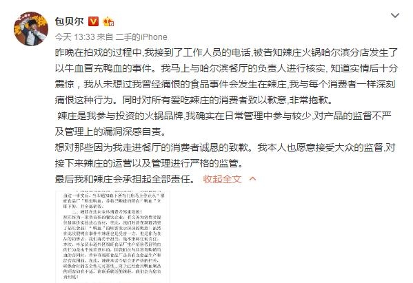 今日,包贝尔公开发声:辣庄是我参与投资的火锅品牌,我确实在日常管理中参与较少,对产品的监督不严及管理上的漏洞深感自责。同时声称对饭店用牛血充当鸭血的事情并不了解,表示要对消费者负责,一定会正确处理此事。