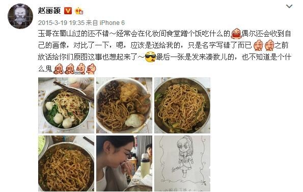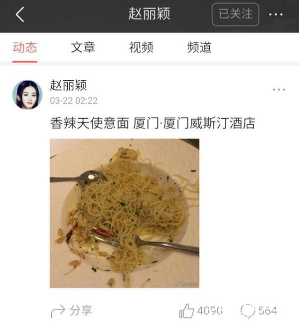 有人会说赵丽颖是饿久了才吃得下这么多,肯定不会,赵丽颖不会放过任何一个能往嘴里塞零食的机会,那几张片场吃零食吃得塞满嘴的照片就是证据。而就在这次晒出早饭之前,赵丽颖还删过一条发出的微博,这就是他前一天晚上吃的夜宵,一碗“香辣天使意面”,发出之后又被赵丽颖删了,有人说赵丽颖怕微博暴露了她的地点,但个人更愿意相信连赵丽颖也不好意思了,深夜放毒本就不可饶恕,更何况吃了夜宵的第二天一早机场里又吃那么多,小朋友可不要模仿赵丽颖姐姐,人家可是天生骨骼清奇。