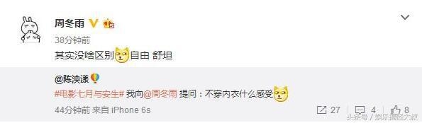 不过对于胸的问题,周冬雨曾经这样回答过哦!当时有粉丝在微博上问:“不穿内衣什么感受?”周冬雨说:“其实没啥区别,自由,舒坦!”好霸气的回答,符合她的性格,向来听自己的。
