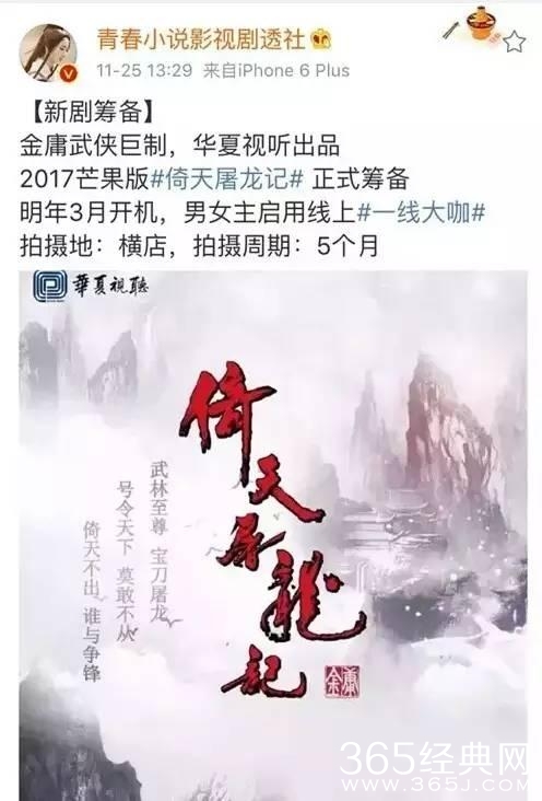 有微博营销号发出消息《倚天屠龙记》又要翻拍了,将在今年的三月份开机,启用一线大咖的阵容,对于芒果版的《倚天屠龙记》你期待吗?