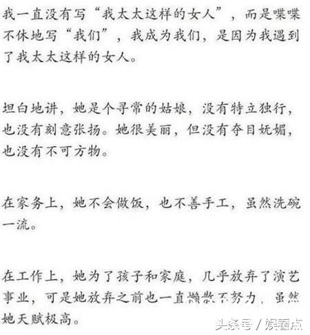 看了黄磊写给妻子的信,我相信大部分的女孩子眼睛可能是湿润的,心里都在想,世界上怎么还有黄磊这样的男人呢,可以不嫌弃老婆没工作,不会做家务,不会教育孩子,思想简单不讳世事,而他还那样的依然爱她,大概这样的爱情只能让人羡慕吧。