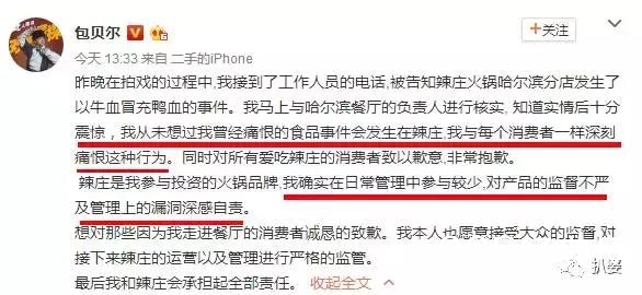 新闻曝光后,包贝尔出来道歉了。