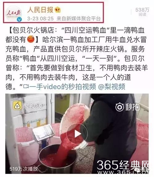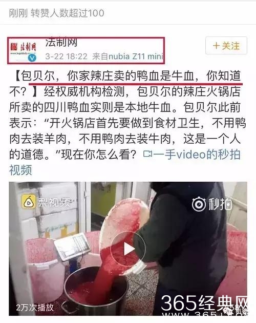 人民日报,法制报,新京报,新浪挨个点名批评,原因是包贝尔开的辣庒火锅店虚假宣传,以次充好,用牛肉冒充鸭血高价卖给食客。