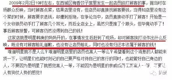 已经倒闭了的韩庚妈妈开的梅花饺子馆,也曾经被爆态度恶劣殴打顾客事后还拒不道歉的事。