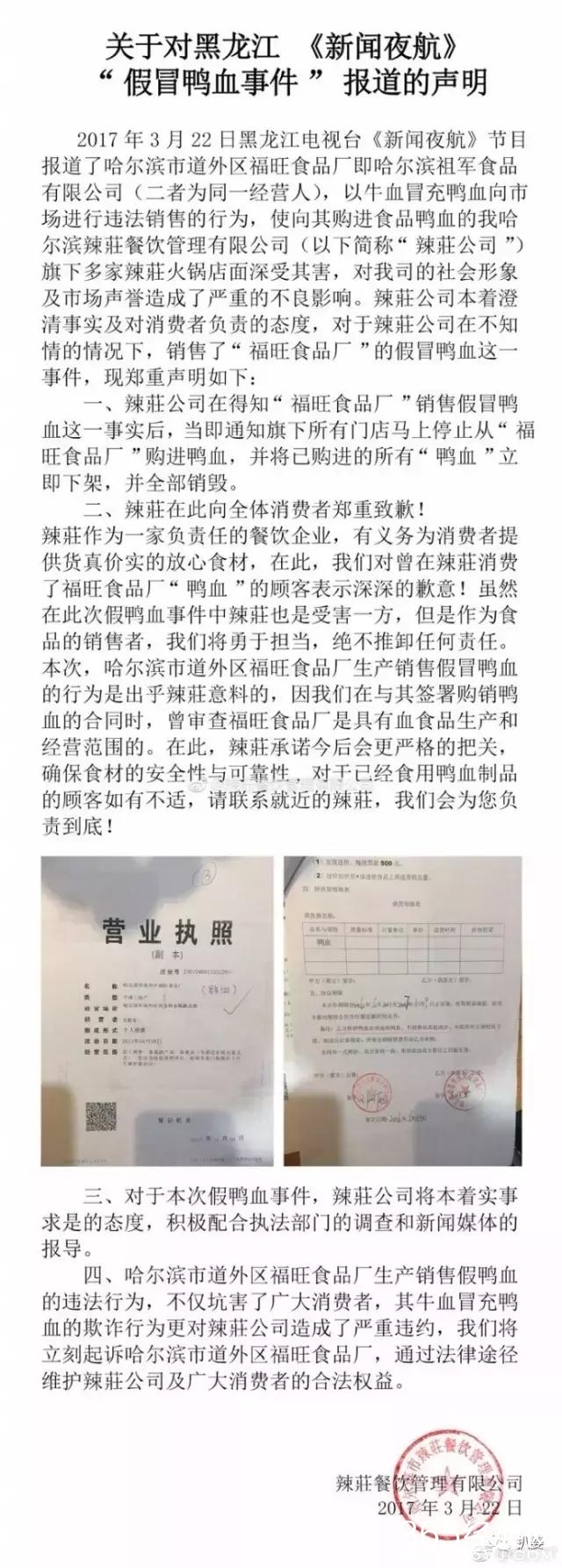 并附加了一份声明,大概内容是我们也是受害者,假鸭血已经全部销毁。