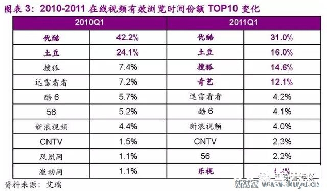 2011年,搜狐、爱奇艺重金投入内容打造,视频网站内容竞争首次迎来小高潮,行业格局从优酷、土豆两家独大转变为优酷、土豆、搜狐、爱奇艺四强纷争,同时乐视网借2010年IPO的资本优势加大热播剧目购买。
