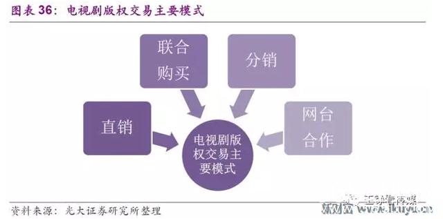 目前国内电视剧主要收入来自版权交易,主要有直销、联合购买、分销以及网台合作等交易模式。联合购买指电视台以及多个视频网站共同购买某部剧版权;分销指某个视频网站购买电视剧版权后再分销给其他平台;网台合作是近年兴起的传统电视台、制作机构、视频网站围绕内容生产制作、播出、广告推广等进行深度合作的版权交易模式。随着在线视频及内容运营商业模式持续探索,电视剧产业上下游未来将在版权以外的广告植入、付费收入、衍生开发等领域产生更多交易。