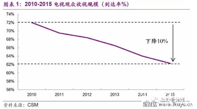2010-2015年我国电视观众的平均到达率由72%逐年下降至62%,观众整体规模进入趋势性下降阶段。