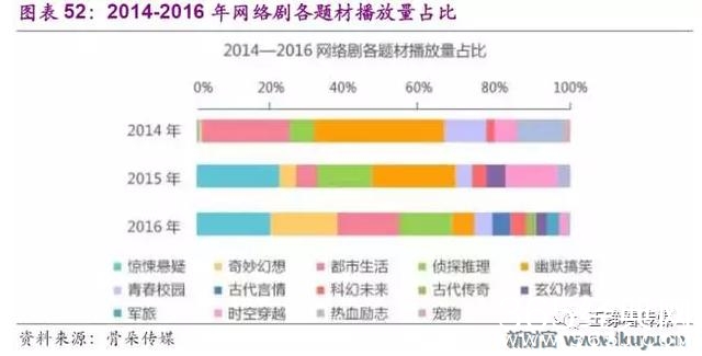 2014-2016年网络剧快速发展,内容题材则与台播剧形成强烈补充,惊悚悬疑、奇妙幻想、侦探推理、幽默搞笑等题材多元丰富;多数网络剧定位都与传统台播剧有明显区分,为网络视频观众提供了创新的内容娱乐。此外,网络剧题材迭代速度明显快于传统台播剧,几大出品方普遍注重跟随观众收视偏好并增加“网感”。