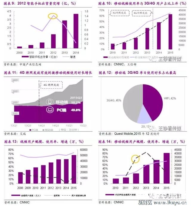 2012年以后智能手机在国内走向普及,3G/4G也迎来快速发展;移动视频用户在2012年以后快速增长,较PC端视频“不限时间”观看视频的便利之外,增加了“不限地点”与“碎片化”观看视频的选择,移动视频因此迅速成为主流的收视选择,对电视收视形成了较强的替代。