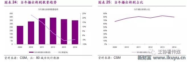 根据CSM统计,2012年以来80城市全天时段每年播出的新剧数量呈现不断减少的趋势,从播出近400部当年新剧,逐步减少到350部左右;说明电视台每年的电视剧播出容量已经饱和,无法依靠数量无法突破渠道壁垒。