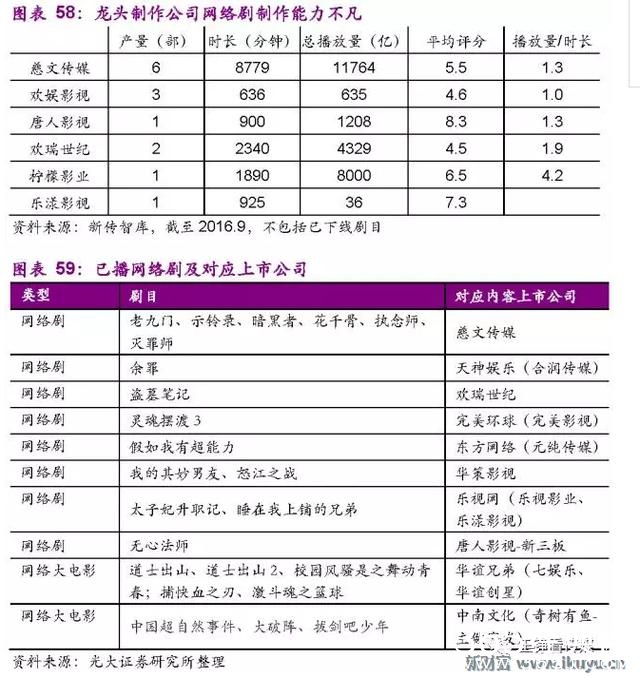 1、随着IP版权水涨船高,中小制作公司出品IP剧成本上升压力较大;且网络视频龙头倾向于与传统IP剧出品公司合作,如腾讯影视与欢瑞、慈文、唐人等公司合作最为密切。