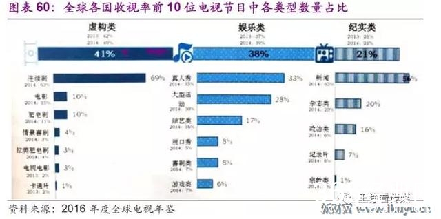 在全球电视市场,一般将节目内容按照不同特质分为虚构类、娱乐类和纪实类。2015年,虚构类节目在收视前10位电视节目中占比达41%,其中电视剧占据虚构类节目市场份额的86%;意味着电视剧在全球各国收视率排名前10的节目中共占据35%的比重,为最受欢迎的节目类型。
