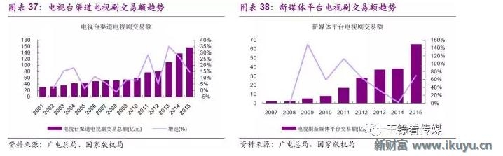 根据广电总局及国家版权局统计,2015年电视剧版权交易额约222亿元,其中电视台渠道交易157亿元,新媒体渠道交易65亿元。由于电视台广告收入已经稳定,新媒体渠道电视剧交易额的快速增长,成为拉动2013-2015年电视剧总交易额维持年均20%以上增速的主要因素。