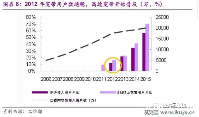 2012年是我国宽带接入端口技术革新的转折点,此前我国宽带接入方式均为XDSL和LAN,8M以上速率的宽带用户占比一直在10%以下(2011年之前8M以上速率宽带用户占比一直为0)。2012年光纤FTTH端口技术开始推广,我国宽带接入端口出现结构性变化,高速率光纤入户迅速普及。