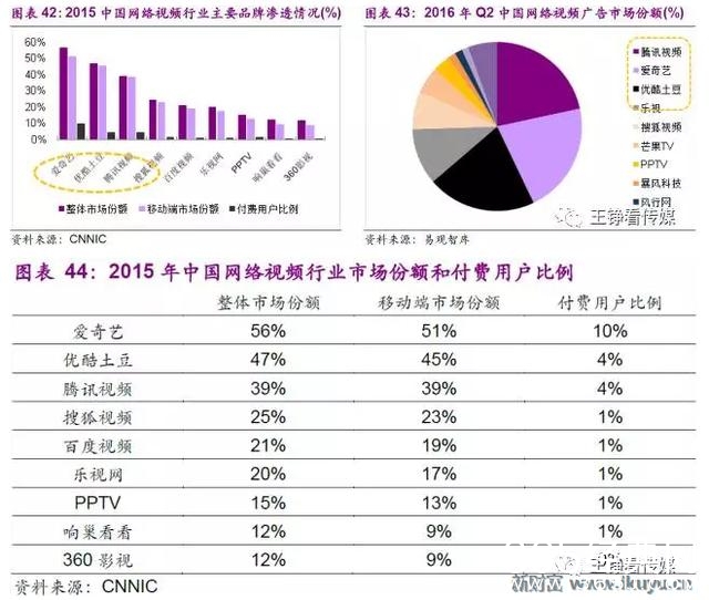 我国网络视频平台经过多年发展集中格局已经形成,爱奇艺、腾讯视频、优酷土豆在渗透率、广告市场份额均处于行业领先地位。当网络视频进入付费时代,TOP3平台的付费用户渗透率也明显领先。前文图表16所跟踪的移动视频APP月度活跃用户数也显示了三大平台的突出优势。
