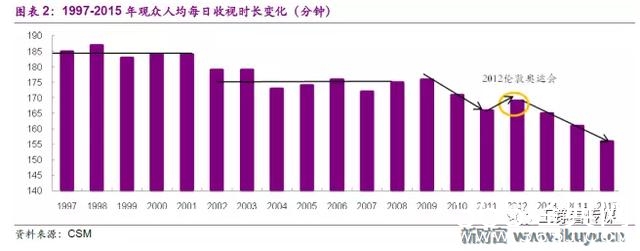 观察1997-2015年间观众人均每日收视时长,1997-2001年人均每日收视时长在185分钟左右,2002-2008年稳定在175分钟左右(其中2006年世界杯与2008年北京奥运会形成两个收视小高峰),而2009-2015年,受互联网特别是移动互联网与智能手机普及冲击,电视观众人均每日收视时长进入持续下降通道(仅2012年伦敦奥运会迎来收视小高峰)。