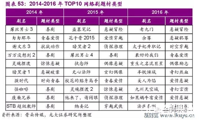2014-2016年10大网络剧在题材上明显有别于传统台播剧,悬疑题材十分受青睐。