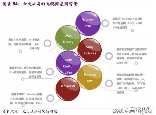 好莱坞六大电影公司中,除了哥伦比亚属于索尼,其余五大分别属于美国拥有五大商业电视网的大型传媒集团,因而美国电视网在主流电影制片方的支持下拥有强大的内容出品能力。