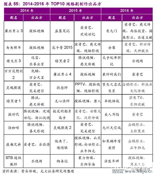 2014-2016年,网剧市场正逐步走上质变的转型升级之路,其制作班底逐渐由小团队制作向正规军入场,精品化进程明显加快。以2014-2016全年十大网络剧为例,越来越多的精英团队涌入网剧市场。2014年,慈文、欢瑞初探网剧市场;2015年网络剧掀起热潮之后,爱奇艺、腾讯视频两大龙头重金投入,主要采取与电视剧业界知名制作团队合作的模式,打造了多部精品“爆款”剧。2015年,慈文、欢瑞、正午阳光、山影、SMG尚世营业、唐人频造网剧爆款,到2016年,再添新丽、上影寰亚劲军,郭靖宇、白一骢、小吉祥天、尹琪、侯鸿亮、唐丽君、蔡艺侬、于正等人成为top10网剧的幕后“网红”。