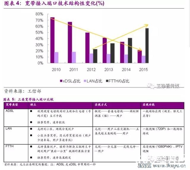 在互联网多种应用中(如网页浏览、社交工具、网络游戏、视频等),高清(1080P以上)的视频播放对网络实际速率要求最高,在xDSL和LAN时代无法实现高清视频的流畅播放。对比XDSL和LAN,光纤入户的FTTH端口技术有效提升了用户网络的实际传输速率,稳定的高速率使得高清视频、IPTV视频的流畅观看成为可能。