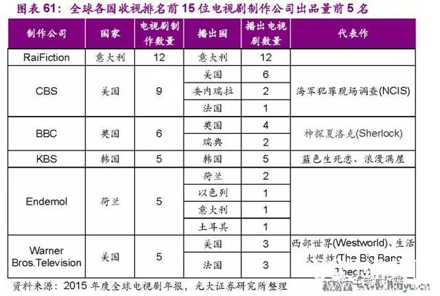在全球的电视剧制作领域,少数制作公司的实力十分惊人。在收视表现最好的210部电视剧中,来自不同国家的6个制作公司所制作的剧集占据了20%的份额。实力强劲的制作公司出品的优质剧目更容易冲破地域与文化的界限,成为具有国际影响力的作品。