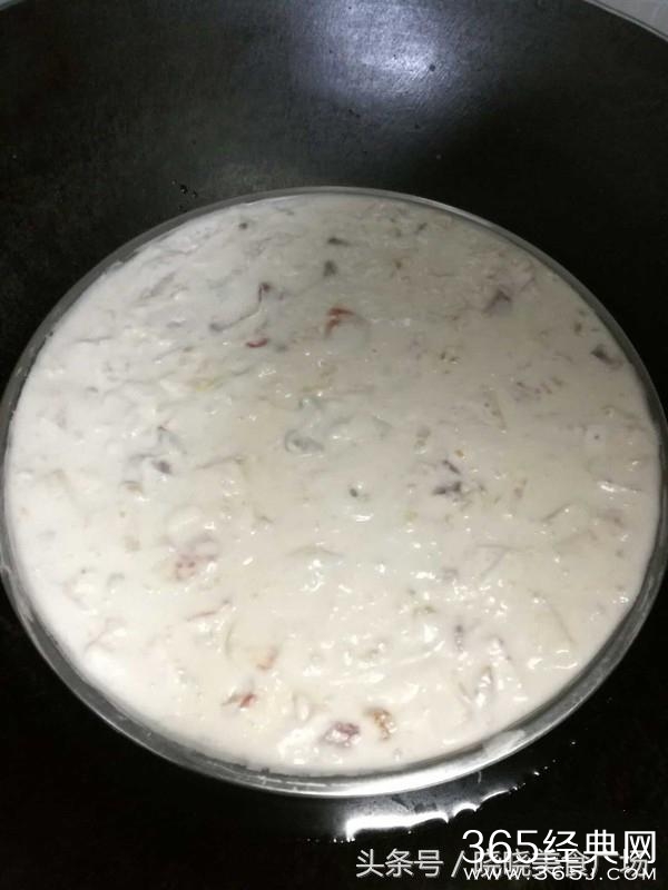 这步是生熟粉,放在锅里隔水加热,直到液体变的浓稠,要不断搅拌,不要糊底。