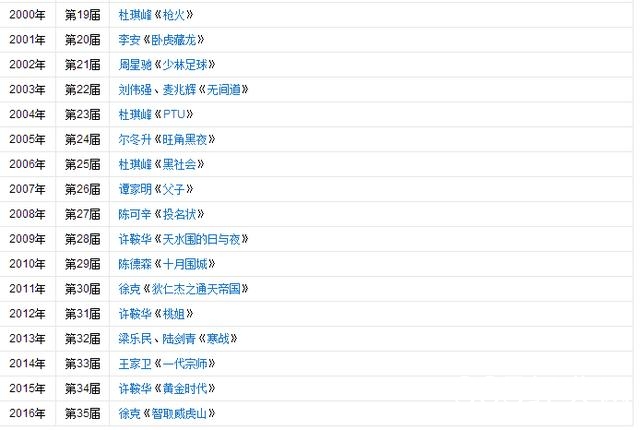 黄进《一念无明》、曾国祥《七月与安生》、杜琪峰《三人行》、周星驰《美人鱼》、许学文、欧文杰、黄伟杰《树大招风》