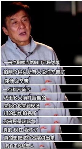 成龙大哥对现在的年轻演员是愤慨至极。他拍戏全身都受过伤,现在年过60,很多动作戏还亲力亲为。自然看不惯娇嫩的鲜肉。