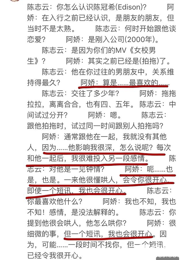 被问到陈冠希是不是过往男朋友中关系维持最久的,阿娇直接说,是最喜欢的。