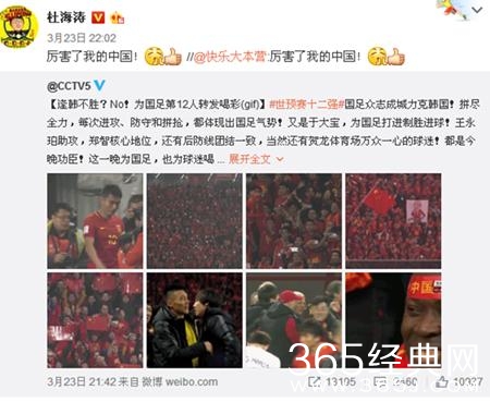 昨日,于大宝头球,国足1-0力克韩国,国人都沸腾了,终于是打破了“逢韩不胜”的魔咒,一时间普天同庆,明星们一时也是激动不已。贾乃亮、陈伟霆、Angelababy、杜海涛纷纷发微博,称赞国足,为中国骄傲,但也不排除其蹭热度的嫌疑。明明是件好事,可baby和海涛却狂遭网友吐槽,称他们是“假艺人”,个个“火力十足”!先一起来看看明星们的激动时刻吧!