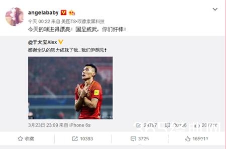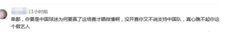 有网友说:“baby你要真是中国球迷干嘛不在开赛前支持国足呢,听说于大宝的女神可是你哦!你非要在国足赢了后赶去蹭热度,真心瞧不起你这个假艺人”。