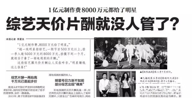 北京日报3月24日刊发文章,直指当下综艺节目天价片酬问题,“1亿元制作费,8000万元给了明星。”超一线明星拍摄不到一个月,能收入5000到8000万元,相当于拍一部电视连续剧的收入。继影视剧天价片酬后,综艺节目的天价片酬问题再次曝光,明星的天价片酬问题又一次成为焦点话题。