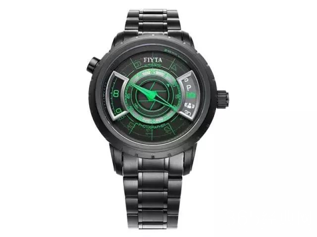 这款腕表灵感来自于机械相机造型,经典全黑设计,点缀荧光绿,很有科技感。