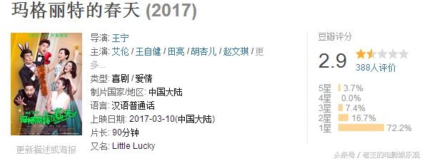 昨天3月24日的首映,有1864万的首映成绩。一向都非常宽容的观众给出了3.8分的超低评分,这是非专业普通观众给出的与豆瓣最接近的评分。