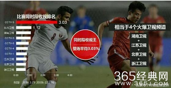 这样的收视率意味着什么呢?我们找一些数据作为对比。去年3月高洪波的中国队,在西安主场2-0击败卡塔尔,获得12强赛资格,那场比赛,央视下半场的收视率为3.7%,相当于湖南卫视+江苏卫视+北京卫视+浙江卫视之和。不过和3月23日中国VS韩国的比赛相比,1年前的中卡之战还是有不小差距!
