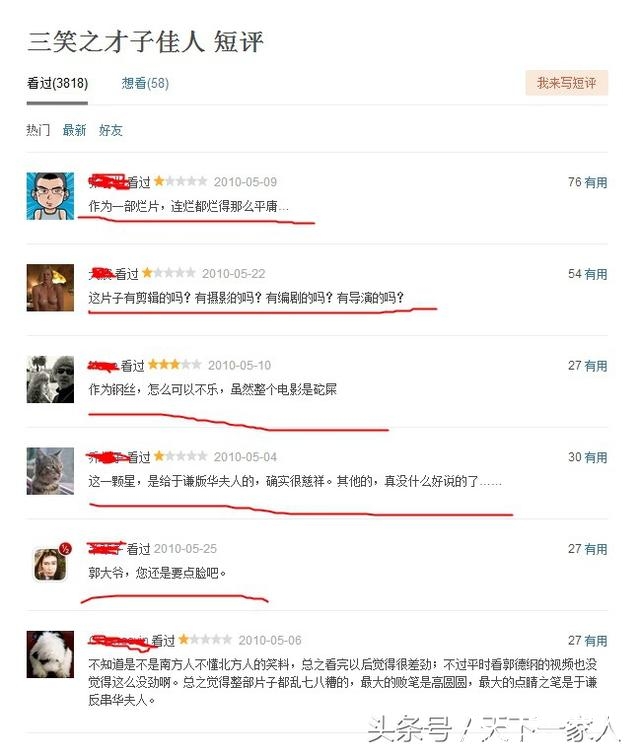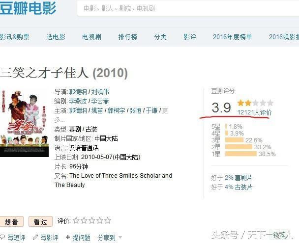 说相声是本行,参加综艺也有情可原,大家吐槽占便宜也不算太大的离谱,参加电影的客串也算是蹭蹭热点,都无可厚非,之前郭大师参加的大宅门,建国大业,大家也没有过多的批评,不过他自己导演的片子可不就是那回事了,其中一部片子三笑之才子佳人,看看大家的评论吧,真是啪啪的打脸。