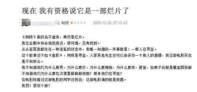 如果说无极还有争议的话,刺陵则是真正的,不折不扣的大烂片。网友对这部片的总结就是毫无思想,主题,就是一群人漫无目的的寻宝,完全不知所云,被封为烂片至尊也不为过了。
