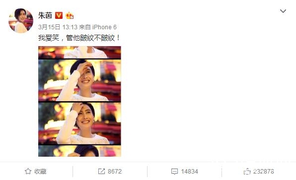 相比之下,这些女神本身倒比我们更看得开,也更潇洒。比如朱茵就在微博上发了几张自己露出笑容的照片,并且配文字说:“我爱笑,管他皱纹不皱纹”。