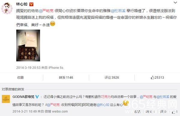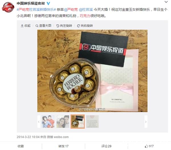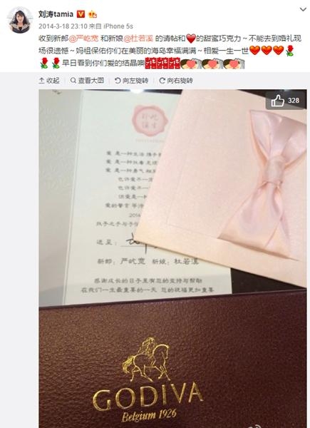 然后他和妻子杜若溪结婚的时候,给林心如、刘涛等一线艺人送歌帝梵的巧克力。