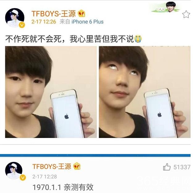 2016年的时候,流行改iphone日期变砖,王源测试之后发布微博称:不作死就不会死