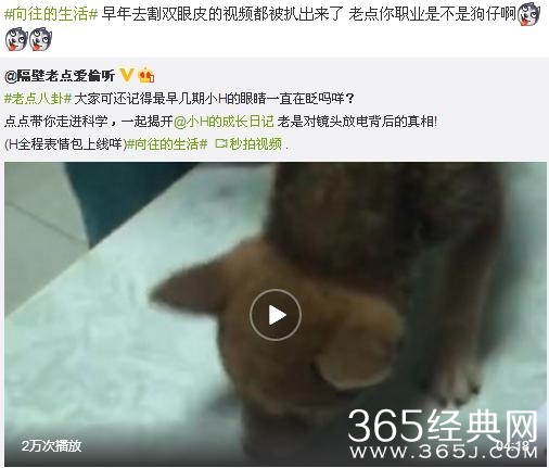 小H开始的时候老对着镜头眨呀眨,原来是眼睛有点问题。小H是一个柴犬,难怪变化这么大。可微博上却说:“早年去割双眼皮的视频都被扒出来了 老点你职业是不是狗仔啊”